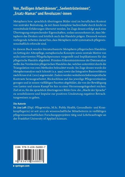 In diesem Buch werden literaturbasierte Metaphern pflegerischen Handelns im Setting der Altenpflege, metaphorische Konzepte sowie zentrale Motive von sechs interviewten Pflegefachpersonen vorgestellt und Implikationen für das pflegerische Handeln abgeleitet. Primäres Erkenntnisinteresse der Datenanalyse stellte das Verständnis pflegerischen Handelns dar, welches unterstützt durch die Triangulation von zwei Methoden beleuchtet wurde. Im Zuge dessen wurde die Metaphernanalyse nach Schmitt (u.a. 1995) sowie das Integrative Basisverfahren nach Kruse et al. (2011) angewendet. Zudem werden wohnbereichsformspezifische Kontraste herausgearbeitet, Rückschlüsse auf das jeweilige Pflegeverständnis gezogen und in seinen vielfältigen Facetten abgebildet, die von der Bewältigung von Lasten und einem Kampf bis hin zu einer Herzensangelegenheit reichen. Ziel ist es, für die sprachlich übertragenen Bilder bzw. die "Macht der Sprache" zu sensibilisieren und Impulse zur positiven Umdeutung negativer Betrachtungsweisen zu geben.