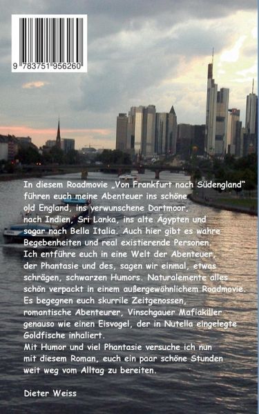 In diesem Roadmovie "von Frankfurt nach Südengland" führen euch meine Abenteuer ins schöne old England, ins verwunschene Dartmoor, nach Indien, Sri Lanka, ins alte Ägypten und sogar nach bella Italia. Auch hier gibt es wahre Begebenheiten und real existierende Personen.Ich entführe euch in eine Welt der Abenteuer, der Phantasie und des, sagen wir einmal, etwas schrägen Humors. Naturalemente alles schön verpackt in einem außergewöhnlichem Roadmovie.Es begegnen euch skurrile Zeitgenossen, romantische Abenteuer, ein Vinschgauer Mafiakiller genauso wie einen Eisvogel,der in Nutella eingelegte Goldfische inhaliert.