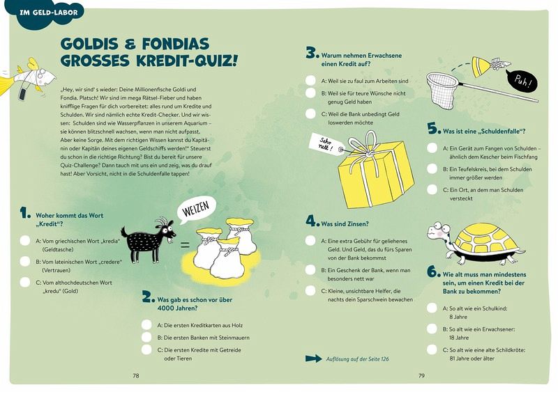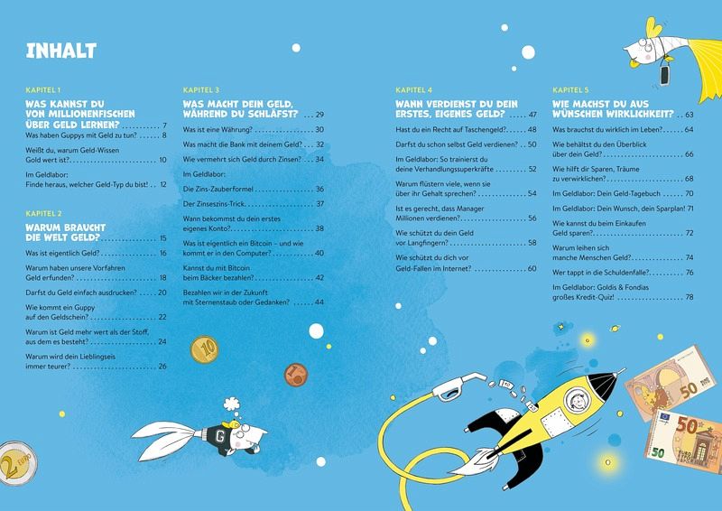 Häufig lernen Kinder in der Schule nur wenig über Wirtschaftsthemen und den Umgang mit Geld. Dieses kindgerecht gestaltete Mitmachbuch macht Finanzbildung zum spannenden Abenteuer. Auf jeder Doppelseite tauchen die beiden Guppys Goldi und Fondia mit jungen Leserinnen und Lesern in die Welt der Finanzen und den verantwortungsvollen Umgang mit Geld ein.
