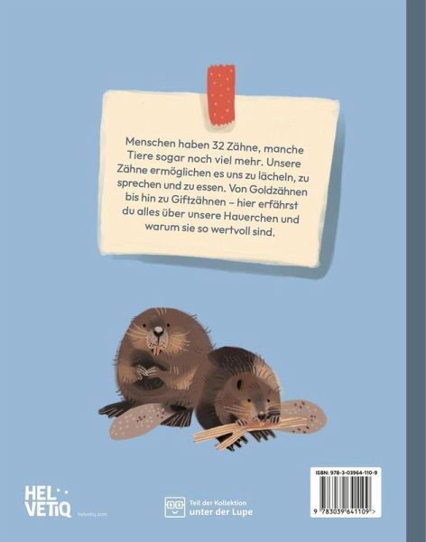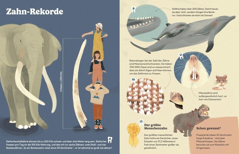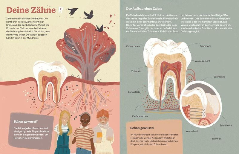 Wieso tragen einige Personen Zahnspangen? Oder was hat es mit den Wikingern und Karies auf sich? Welches Tier benutzt seine Zähne, um Gift in seine Beute zu injizieren? Und welches hat am meisten Zähne? Menschen haben 32 Zähne, einige Tiere sehr viel mehr. Wie Fingerabdrücke sind auch die Zähne jedes Individuums einzigartig. Jeder Zahn hat seine eigene Funktion und entsprechend seine eigene Form und Eigenheiten. Zähne helfen uns beim Lächeln, beim Sprechen und beim Schlucken. Beim Menschen wachsen sie zwei Mal, bei Haifischen bis zu 30 000 Mal!Dieses Buch vermittelt, wieso Zähne so wichtig sind und wie man sie am besten pflegen kann. Ein spielerischer Zugang zu Zähnen und Zahnpflege, der die Angst vor dem nächsten Zahnarztbesuch nimmt.