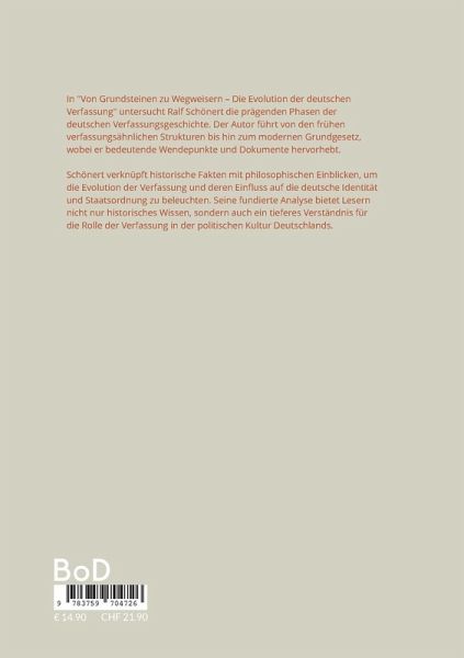 In "Von Grundsteinen zu Wegweisern - Die Evolution der deutschen Verfassung" untersucht Ralf Schönert die prägenden Phasen der deutschen Verfassungsgeschichte. Der Autor führt von den frühen verfassungsähnlichen Strukturen bis hin zum modernen Grundgesetz, wobei er bedeutende Wendepunkte und Dokumente hervorhebt. Schönert verknüpft historische Fakten mit philosophischen Einblicken, um die Evolution der Verfassung und deren Einfluss auf die deutsche Identität und Staatsordnung zu beleuchten. Seine fundierte Analyse bietet Lesern nicht nur historisches Wissen, sondern auch ein tieferes Verständnis für die Rolle der Verfassung in der politischen Kultur Deutschlands.