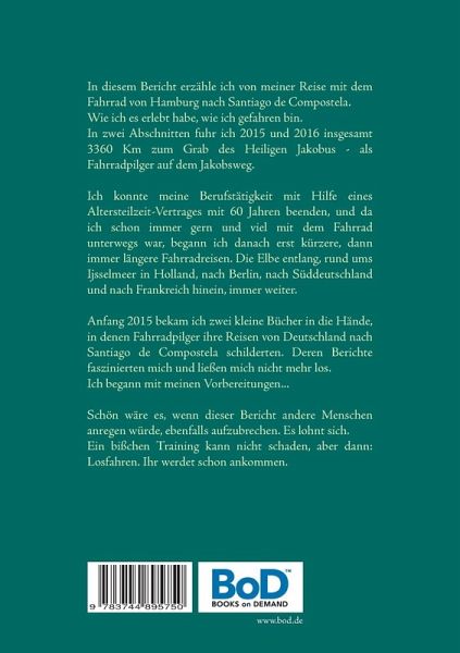 In diesem Bericht erzähle ich von meiner Reise mit dem Fahrrad von Hamburg nach Santiago de Compostela. Wie ich es erlebt habe, wie ich gefahren bin.In zwei Abschnitten fuhr ich 2015 und 2016 insgesamt 3360 Km zum Grab des Heiligen Jakobus - als Fahrradpilger auf dem Jakobsweg.Ich konnte meine Berufstätigkeit mit Hilfe eines Altersteilzeitvertrages mit 60 Jahren beenden.Da ich schon immer gern und viel mit dem Fahrrad unterwegs war, begann ich erst kürzere, dann immer längere Fahrradreisen. Die Elbe entlang, rund ums Ijsselmeer in Holland, nach Berlin, nach Süddeutschland und nach Frankreich hinein, immer weiter. Anfang 2015 bekam ich zwei kleine Bücher in die Hände, in denen Fahrradpilger ihre Reisen von Deutschland nach Santiago de Compostela schilderten. Deren Berichte faszinierten mich und ließen mich nicht mehr los.Und ich begann mit den Vorbereitungen ...Schön wäre es, wenn dieser Bericht andere Menschen anregen würde, ebenfalls aufzubrechen. Es lohnt sich. Ein bisschen Training kann nicht schaden, aber dann: Losfahren. Ihr werdet schon ankommen.