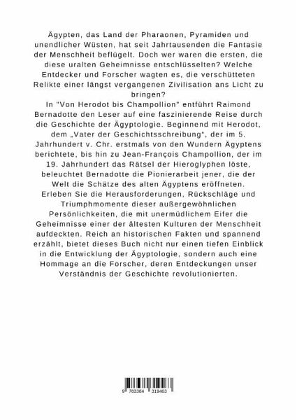 Ägypten, das Land der Pharaonen, Pyramiden und unendlicher Wüsten, hat seit Jahrtausenden die Fantasie der Menschheit beflügelt. Doch wer waren die ersten, die diese uralten Geheimnisse entschlüsselten? Welche Entdecker und Forscher wagten es, die verschütteten Relikte einer längst vergangenen Zivilisation ans Licht zu bringen?In "Von Herodot bis Champollion" entführt Raimond Bernadotte den Leser auf eine faszinierende Reise durch die Geschichte der Ägyptologie. Beginnend mit Herodot, dem "Vater der Geschichtsschreibung", der im 5. Jahrhundert v. Chr. erstmals von den Wundern Ägyptens berichtete, bis hin zu Jean-François Champollion, der im 19. Jahrhundert das Rätsel der Hieroglyphen löste, beleuchtet Bernadotte die Pionierarbeit jener, die der Welt die Schätze des alten Ägyptens eröffneten.Erleben Sie die Herausforderungen, Rückschläge und Triumphmomente dieser außergewöhnlichen Persönlichkeiten, die mit unermüdlichem Eifer die Geheimnisse einer der ältesten Kulturen der Menschheit aufdeckten. Reich an historischen Fakten und spannend erzählt, bietet dieses Buch nicht nur einen tiefen Einblick in die Entwicklung der Ägyptologie, sondern auch eine Hommage an die Forscher, deren Entdeckungen unser Verständnis der Geschichte revolutionierten.