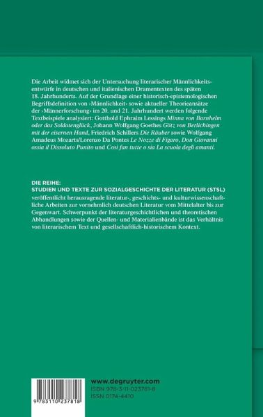 Die Arbeit widmet sich der Untersuchung literarischer Männlichkeitsentwürfe in deutschen und italienischen Dramentexten des späten 18. Jahrhunderts. Auf der Grundlage einer historisch-epistemologischen Begriffsdefinition von 'Männlichkeit' sowie aktueller Theorieansätze der 'Männerforschung' im 20. und 21. Jahrhundert werden folgende Textbeispiele analysiert: Gotthold Ephraim Lessings Minna von Barnhelm oder das Soldatenglück, Johann Wolfgang Goethes Götz von Berlichingen mit der eisernen Hand, Friedrich Schillers Die Räuber sowie Wolfgang Amadeus Mozarts / Lorenzo Da Pontes Le Nozze di Figaro, Don Giovanni ossia il Dissoluto Punito und Così fan tutte o sia La scuola degli amanti.