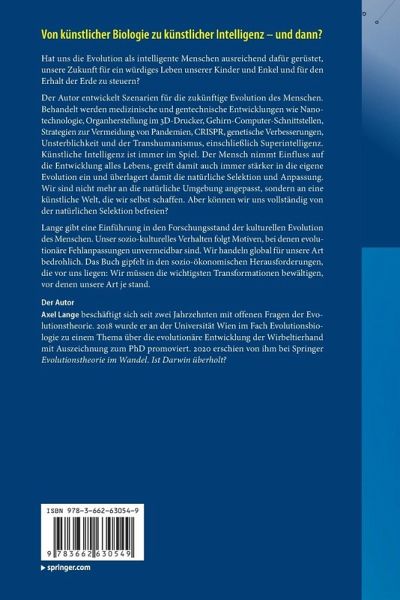 Der Autor entwickelt Szenarien für die zukünftige Evolution des Menschen. Behandelt werden medizinische und gentechnische Entwicklungen wie Nanotechnologie, Organherstellung im 3D-Drucker, Gehirn-Computer-Schnittstellen, Strategien zur Vermeidung von Pandemien, CRISPR, genetische Verbesserungen, Unsterblichkeit und der Transhumanismus, einschließlich Superintelligenz. Künstliche Intelligenz ist immer im Spiel. Der Mensch nimmt Einfluss auf die Entwicklung alles Lebens, greift damit auch immer stärker in die eigene Evolution ein und überlagert damit die natürliche Selektion und Anpassung. Wir sind nicht mehr an die natürliche Umgebung angepasst, sondern an eine künstliche Welt, die wir selbst schaffen. Aber können wir uns vollständig von der natürlichen Selektion befreien?