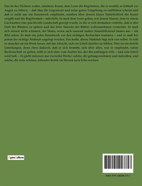 Das ist des Dichters wahre, erhabene Kunst, dem Leser die Begebnisse, die er erzählt, so lebhaft vor Augen zu führen, ¿ daß ihm die Gegenwart und seine ganze Umgebung zu entfliehen scheint und daß er nicht nur ein Kunstwerk empfindet, sondern über dessen klarer Natürlichkeit die Kunst vergißt und die Begebenheit ¿ miterlebt. Es muß dem Leser gehen, wie jenem Manne, dem in einem Guckkasten eine prachtvolle Landschaft gezeigt wurde, in die er sich dermaßen vertiefte, daß er den Duft der Blumen zu spüren und das leise Säuseln der Blätter wahrzunehmen vermeinte. Er muß sich dessen nicht schämen, der Mann, wenn auch tausend andere hineinblickend immer nur ¿ ein Bild sehen. Es muß ein jedes Kunstwerk vor den richtigen Beobachter kommen ¿ und es muß bei jedem der richtige Maßstab angelegt werden. Das heißt, dieser Maßstab fügt sich von selbst. Es tritt so mancher an ein Werk heran, mit der Absicht, sich ein Urteil darüber zu bilden. Dies ist ein töricht Unterfangen, denn eben dadurch, daß er sich bemüht, sich über alles, was er empfindet, sofort Rechenschaft zu geben, reißt er sich stets vom Zauber los, der ihn umfangen will, ¿ und sein Urteil wird kalt. ¿ Es giebt indessen nur zweierlei Werke: solche, die gefangennehmen und mitreißen, und solche, die trotz schöner, lobender Kritik im Herzen kein Echo wecken.