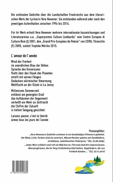 Die schönsten Gedichte über die Landschaften Frankreichs aus dem literarischen Werk der Lyrikerin Vera Hewener. Sie entstanden während oder nach den jeweiligen Aufenthalten zwischen 1996 bis 2016. Einige Gedichte wurden mit internationalen Literaturpreisen ausgezeichnet, wie z.B. "Reise nach Aquitanien" und "Atlantischer Sommer" mit dem 2. Preis beim Internationalen Literaturwettbewerb "Omaggio ad Alessandro Manzoni" des Centro Europeo di Cultura in Rom (I) im April 1999 oder "Der Vogelkundler" beim 14. Internationalen Literaturwettbewerb des CEPAL, Europäisches Zentrums für die Förderung von Kunst und Literatur in Thionville (F) im September 2013 mit dem Prix Goethe als bestes Gedicht in der Kategorie Allemand - Recueil/Werk.