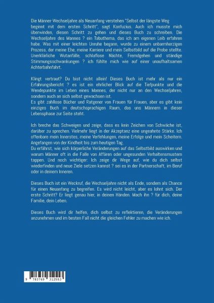 Die Männer-Wechseljahre als Neuanfang verstehen "Selbst der längste Weg beginnt mit dem ersten Schritt", sagt Konfuzius. Auch ich musste mich überwinden, diesen Schritt zu gehen und dieses Buch zu schreiben. Die Wechseljahre des Mannes ? ein Tabuthema, das ich am eigenen Leib erfahren habe. Was mit einer leichten Unruhe begann, wurde zu einem unbarmherzigen Prozess, der meine Ehe, meine Karriere und mein Selbstbild auf die Probe stellte. Unerklärliche Wutanfälle, schlaflose Nächte, Fremdgehen und ständige Stimmungsschwankungen ? ich fühlte mich wie auf einer unaufhaltsamen Achterbahnfahrt. Klingt vertraut? Du bist nicht allein! Dieses Buch ist mehr als nur ein Erfahrungsbericht ? es ist ein ehrlicher Blick auf die Tiefpunkte und die Wendepunkte im Leben eines Mannes, der nicht nur an den Wechseljahren, sondern auch an sich selbst gewachsen ist. Es gibt zahllose Bücher und Ratgener von Frauen für Frauen, aber es gibt kein einziges Buch im deutschsprachigen Raum, das uns Männern in dieser Lebensphase zur Seite steht. Ich breche das Schweigen und zeige, dass es kein Zeichen von Schwäche ist, darüber zu sprechen. Vielmehr liegt in der Akzeptanz eine ungeahnte Stärke. Ich offenbare mein Innerstes, meine Verfehlungen, meine Erfolge und mein Scheitern. Angefangen von der Kindheit bis zum heutigen Tag. Du erfährst, wie sich körperliche Veränderungen auf das Selbstbild auswirken und warum Männer oft in die Falle von Affären oder ungesunden Verhaltensmustern tappen. Und noch wichtiger: Ich zeige dir Wege auf, wie du dich selbst wiederfinden und neue Ziele setzen kannst ? sei es in der Partnerschaft, im Beruf oder in deinem Inneren. Dieses Buch ist ein Weckruf, die Wechseljahre nicht als Ende, sondern als Chance für einen Neuanfang zu begreifen. Es wird nicht leicht, aber es lohnt sich. Der erste Schritt? Er liegt genau hier, in deinen Händen. Mach ihn ? für dich, deine Familie, dein Leben. Dieses Buch wird dir helfen, dich selbst zu reflektieren, die Veränderungen anzunehmen und im besten Fall nicht die gleichen Fehler zu machen wie ich.