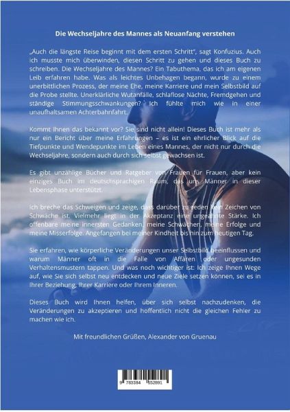 Die Wechseljahre des Mannes als Neuanfang verstehen"Auch die längste Reise beginnt mit dem ersten Schritt", sagt Konfuzius. Auch ich musste mich überwinden, diesen Schritt zu gehen und dieses Buch zu schreiben. Die Wechseljahre des Mannes? Ein Tabuthema, das ich am eigenen Leib erfahren habe. Was als leichtes Unbehagen begann, wurde zu einem unerbittlichen Prozess, der meine Ehe, meine Karriere und mein Selbstbild auf die Probe stellte. Unerklärliche Wutanfälle, schlaflose Nächte, Fremdgehen und ständige Stimmungsschwankungen? Ich fühlte mich wie in einer unaufhaltsamen Achterbahnfahrt.Kommt Ihnen das bekannt vor? Sie sind nicht allein! Dieses Buch ist mehr als nur ein Bericht über meine Erfahrungen - es ist ein ehrlicher Blick auf die Tiefpunkte und Wendepunkte im Leben eines Mannes, der nicht nur durch die Wechseljahre, sondern auch durch sich selbst gewachsen ist.Es gibt unzählige Bücher und Ratgeber von Frauen für Frauen, aber kein einziges Buch im deutschsprachigen Raum, dasuns Männer in dieser Lebensphase unterstützt.Ich breche das Schweigen und zeige, dass darüber zu reden kein Zeichen von Schwäche ist. Vielmehr liegt in der Akzeptanz eine ungeahnte Stärke. Ich offenbare meine innersten Gedanken, meine Schwächen, meine Erfolge und meine Misserfolge. Angefangen bei meiner Kindheit bis hin zum heutigen Tag.Sie erfahren, wie körperliche Veränderungen unser Selbstbild beeinflussen und warum Männer oft in die Falle von Affären oder ungesunden Verhaltensmustern tappen. Und was noch wichtiger ist: Ich zeige Ihnen Wege auf, wie Sie sich selbst neu entdecken und neue Ziele setzen können, sei es in Ihrer Beziehung, Ihrer Karriere oder Ihrem Inneren.Dieses Buch wird Ihnen helfen, über sich selbst nachzudenken, die Veränderungen zu akzeptieren und hoffentlich nicht die gleichen Fehler zu machen wie ich.Mit freundlichen Grüßen, Alexander von Gruenau