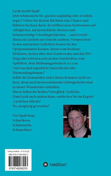 Lyrik macht Spaß! Jetzt schmunzeln Sie, gucken ungläubig oder zweifeln sogar? Geben Sie diesem Büchlein eine Chance und blättern Sie darin. Es eröffnet neue Sichtweisen auf Alltägliches, auf menschliche Macken und liebenswürdige Unzulänglichkeiten ... und es wird Ihnen ein Lächeln ins Gesicht zaubern. Versprochen!In den satirischen Gedichten lernen Sie den Optipessimisten kennen, hören vom Krokant-Elefanten, lachen über den Genderwahn und das ING-Ding oder erfreuen sich an den Geschichten vom Apfelbrot, dem Maibaumgartenloch u.v.a.m. Der Lyrikband ist eine Hommage an den unvergleichlichen Eugen Roth ("Ein Mensch...").Und was sind eigentlich Limerickoide oder Dürmendingsbumse? Selbst die Romantiker unter Ihnen kommen nicht zu kurz, denn auch herzerwärmende Liebesgedichte sind in dieser Wundertüte enthalten. Eltern lieben die beiden Vaterglück-Gedichte. Dass Lyrik auch anders kann, entdecken Sie im Kapitel "Lyrisches Allerlei".Na, neugierig geworden? Viel Spaß beim Schmökern, Schmunzeln, Schmachten!