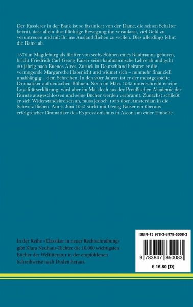 In der Reihe »Klassiker in neuer Rechtschreibung« gibt Klara Neuhaus-Richter die wichtigsten Bücher der Weltliteratur in der empfohlenen Schreibweise nach Duden heraus. Georg Kaiser: Von morgens bis mitternachts. Ein expressionistisches Stationendrama Der Kassierer in der Bank ist so fasziniert von der Dame, die seinen Schalter betritt, dass allein ihre flüchtige Bewegung ihn veranlasst, viel Geld zu veruntreuen und mit ihr ins Ausland fliehen zu wollen. Dies allerdings lehnt die Dame ab. Entstanden: 1912. Erstdruck: G. Müller, München, 1916. Uraufführung: 28. April 1917, München. Neu herausgegeben von Klara Neuhaus-Richter, Berlin 2021. Umschlaggestaltung von Rainer Richter unter Verwendung einer Porträtzeichnung von Josefine Weinschrott. Gesetzt aus der Minion Pro, 11 pt. Henricus - Edition Deutsche Klassik GmbH Über den Autor: 1878 in Magdeburg als fünfter von sechs Söhnen eines Kaufmanns geboren, bricht Friedrich Carl Georg Kaiser seine kaufmännische Lehre ab und geht 20-jährig nach Buenos Aires. Zurück in Deutschland heiratet er die vermögende Margarethe Habenicht und widmet sich ¿ nunmehr finanziell unabhängig ¿ dem Schreiben. In den 20er Jahren ist er der meistgespielte Dramatiker auf deutschen Bühnen. Noch im März 1933 unterschreibt er eine Loyalitätserklärung, wird aber im Mai doch aus der Preußischen Akademie der Künste ausgeschlossen und seine Bücher werden verbrannt. Zunächst schließt er sich Widerstandskreisen an, muss jedoch 1938 über Amsterdam in die Schweiz fliehen. Am 4. Juni 1945 stirbt mit Georg Kaiser ein überaus erfolgreicher Dramatiker des Expressionismus in Ascona an einer Embolie.