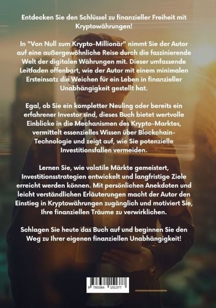Entdecken Sie den Schlüssel zu finanzieller Freiheit mit Kryptowährungen!In "Von Null zum Krypto-Millionär" nimmt Sie der Autor auf eine außergewöhnliche Reise durch die faszinierende Welt der digitalen Währungen mit. Dieser umfassende Leitfaden offenbart, wie der Autor mit einem minimalen Ersteinsatz die Weichen für ein Leben in finanzieller Unabhängigkeit gestellt hat.Egal, ob Sie ein kompletter Neuling oder bereits ein erfahrener Investor sind, dieses Buch bietet wertvolle Einblicke in die Mechanismen des Krypto-Marktes, vermittelt essenzielles Wissen über Blockchain-Technologie und zeigt auf, wie Sie potenzielle Investitionsfallen vermeiden.Lernen Sie, wie volatile Märkte gemeistert, Investitionsstrategien entwickelt und langfristige Ziele erreicht werden können. Mit persönlichen Anekdoten und leicht verständlichen Erläuterungen macht der Autor den Einstieg in Kryptowährungen zugänglich und motiviert Sie, Ihre finanziellen Träume zu verwirklichen.Schlagen Sie heute das Buch auf und beginnen Sie den Weg zu Ihrer eigenen finanziellen Unabhängigkeit!