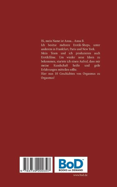 Hi, mein Name ist Anna... Anna B.Ich besitze mehrere Erotik-Shops, unter anderem in Frankfurt, Paris und New York.Mein Team und ich produzieren auch Erotikfilme. Um wieder neue Ideen zu bekommen, startete ich einen Aufruf, dass mir meine Kundschaft heiße und geile Erfahrungen mitteilen sollte. Hier nun 10 Geschichten von Orgasmus zu Orgasmus!