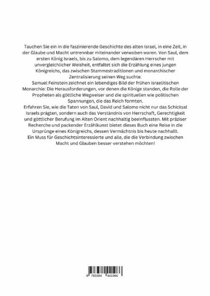 Tauchen Sie ein in die faszinierende Geschichte des alten Israel, in eine Zeit, in der Glaube und Macht untrennbar miteinander verwoben waren. Von Saul, dem ersten König Israels, bis zu Salomo, dem legendären Herrscher mit unvergleichlicher Weisheit, entfaltet sich die Erzählung eines jungen Königreichs, das zwischen Stammestraditionen und monarchischer Zentralisierung seinen Weg suchte.Samuel Feinstein zeichnet ein lebendiges Bild der frühen israelitischen Monarchie: Die Herausforderungen, vor denen die Könige standen, die Rolle der Propheten als göttliche Wegweiser und die spirituellen wie politischen Spannungen, die das Reich formten.Erfahren Sie, wie die Taten von Saul, David und Salomo nicht nur das Schicksal Israels prägten, sondern auch das Verständnis von Herrschaft, Gerechtigkeit und göttlicher Berufung im Alten Orient nachhaltig beeinflussten. Mit präziser Recherche und packender Erzählkunst bietet dieses Buch eine Reise in die Ursprünge eines Königreichs, dessen Vermächtnis bis heute nachhallt.Ein Muss für Geschichtsinteressierte und alle, die die Verbindung zwischen Macht und Glauben besser verstehen möchten!