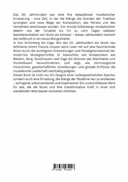Das 20. Jahrhundert war eine Ära beispielloser musikalischer Erneuerung - eine Zeit, in der die Klänge die Grenzen der Tradition sprengten und neue Wege der Komposition, des Hörens und des Verstehens erschlossen wurden. Von Arnold Schönbergs revolutionärer Abkehr von der Tonalität bis hin zu John Cages radikaler Neuinterpretation von Musik als Konzept - dieses Jahrhundert markiert den Aufbruch in ein neues Klangzeitalter.In Von Schönberg bis Cage: Wie das 20. Jahrhundert die Musik neu definierte nimmt Francis Cooper seine Leser mit auf eine faszinierende Reise durch die wichtigsten Entwicklungen und Paradigmenwechsel der modernen Musikgeschichte. Er beleuchtet, wie Komponisten wie Webern, Berg, Stockhausen und Cage die Grenzen des Machbaren und Vorstellbaren herausforderten, und zeigt, wie technologische Fortschritte, gesellschaftliche Umwälzungen und globale Einflüsse die musikalische Landschaft nachhaltig prägten.Dieses Buch ist nicht nur ein Zeugnis einer außergewöhnlichen Epoche, sondern auch eine Einladung, die Klänge der Moderne neu zu entdecken - aufregend, unkonventionell und inspirierend. Ein unverzichtbares Werk für alle, die die Musik und ihre transformative Kraft in einer sich wandelnden Welt besser verstehen möchten.