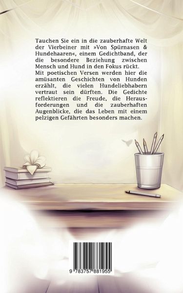 Willkommen in der bezaubernden Welt der Vierbeiner mit »Von Spürnasen & Hundehaaren«, einem Gedichtband, der die einzigartige Verbindung zwischen Mensch und Hund in den Mittelpunkt stellt. Von treuen Blicken und verspielten Streifzügen bis hin zu tiefen Bindungen und unvergesslichen Abenteuern - diese Gedichte erkunden die vielfältigen Facetten des Lebens mit Hunden.Mit poetischen Versen werden die kleinen Geschichten von Hunden erzählt, die vielen Hundeliebhabern vertraut sein dürften. Diese Hundegedichte reflektieren die Freude, die Herausforderungen und die zauberhaften Augenblicke, die das Leben mit einem pelzigen Gefährten besonders machen.
