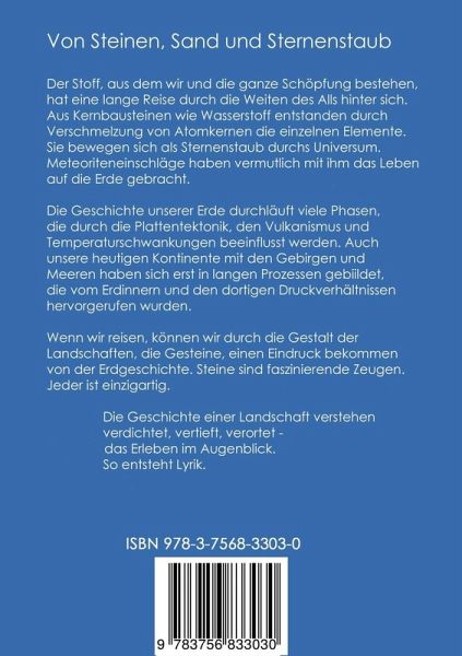 Von Steinen, Sand und SternenstaubEin Geologe, der eine Landschaft überblickt, wird aus der Vegetation schon erste Schlußfolgerungen hinsichtlich des Untergrunds ziehen. Steinbrüche und andere Aufschlüsse, die Gestein bloßlegen, werden ein Übriges tun.Kosmologen beschreiben den Beginn des Universums als Urknall. Was war davor? Ein Nichts ist nicht vorstellbar. Mit dem Big Bang begannen Materie, Raum und Zeit, und sie expandierten, tun es immer noch. Eine unbekannte dunkle Energie treibt den Kosmos mitsamt seinen Galaxien immer schneller auseinander.Zunächst bildeten sich Kernbausteine, leichte und einfach aufgebaute Elemente. Wasserstoff war das erste. Alle schweren Elemente entstanden später durch die Verschmelzung von Atomkernen. 80 Elemente gelten heute als stabil. Sie bewegen sich als Sternenstaub durchs Universum. Meteoriteneinschläge haben vermutlich den Sternenstaub und damit das Leben auf die Erde gebracht.Der Stoff, aus dem wir und die ganze Schöpfung bestehen, hat alsoeine lange Reise durch die Weiten des Alls hinter sich.Die Geschichte unserer Erde durchläuft viele Phasen, die durch die Plattentektonik, den Vulkanismus, sowie Temperaturschwankungen beeinflusst werden. Auch unsere heutigen Kontinente mit den Gebirgen und Meeren haben sich erst in langen Prozessen gebildet, die vom Erdinnern und den dortigen Druckverhältnissen hervorgerufen werden.Wenn wir reisen, können wir durch die Gestalt der Landschaften, die Gesteine, einen Eindruck bekommen von der Erdgeschichte. So haben die Gletscher der letzten Eiszeiten Gestein an der Ostseeküste abgelegt und die norddeutsche Tiefebene geformt. Auf der Schwäbischen Alb können wir die Schichten des Jura erkennen und wie der Stein die Landschaft prägt. Steine sind faszinierende Zeugen der Erdgeschichte. Jeder ist einzigartig.Die Geschichte einer Landschaft verstehenverdichtet, vertieft, verortet -das Erleben im Augenblick.So entsteht Lyrik.
