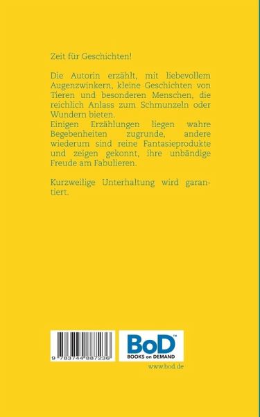 Zeit für Geschichten!Die Autorin erzählt, mit liebevollem Augenzwinkern, kleine Geschichten von Tieren und besonderen Menschen, die reichlich Anlass zum Schmunzeln oder Wundern bieten. Einigen Erzählungen liegen wahre Begebenheiten zugrunde, andere wiederum sind reine Fantasieprodukte und zeigen gekonnt, eine unbändige Freude am Fabulieren.Kurzweilige Unterhaltung wird garantiert.