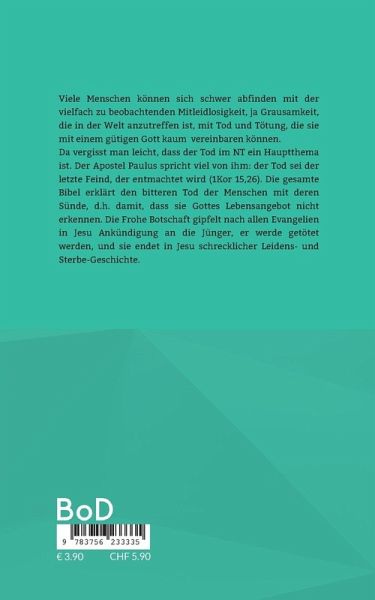 Viele Menschen können sich schwer abfinden mit der vielfach zu beobachtenden Mitleidlosigkeit, ja Grausamkeit, die in der Welt anzutreffen ist, mit Tod und Tötung, die sie mit einem gütigen Gott kaum vereinbaren können. Da vergisst man leicht, dass der Tod im NT ein Hauptthema ist. Der Apostel Paulus spricht viel von ihm: der Tod sei der letzte Feind, der entmachtet wird (1Kor 15,26). Die gesamte Bibel erklärt den bitteren Tod der Menschen mit deren Sünde, d.h. damit, dass sie Gottes Lebensangebot nicht erkennen. Die Frohe Botschaft gipfelt nach allen Evangelien in Jesu Ankündigung an die Jünger, er werde getötet werden, und sie endet in Jesu schrecklicher Leidens- und Sterbe-Geschichte.Herausgeber: Hans-Jürgen Sträter, Adlerstein Verlag