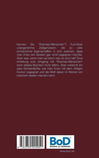 Kennen Sie "Klischee-Menschen"? Furchtbar unangenehme Zeitgenossen, die so viele schreckliche Eigenschaften in sich vereinen, dass man ihnen am liebsten gar nicht begegnen möchte. Aber was, wenn man sie doch mal um sich hat? Eine Anleitung zum Umgang mit "Klischee-Menschen" kann dieses Büchlein nicht liefern. Aber vielleicht ein paar Denkanstöße, wie man ihnen mit dem nötigen Humor begegnet und die Welt dabei im Kleinen ein bisschen besser machen kann.