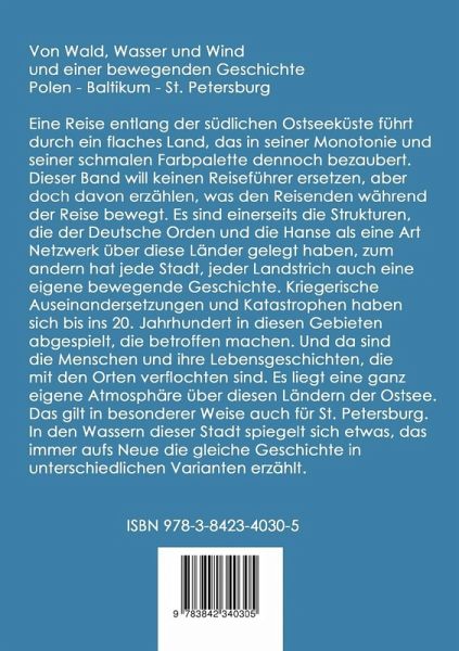 Eine Reise entlang der südlichen Ostseeküste führt durch ein flaches Land, das in seiner Monotonie und seiner schmalen Farbpalette dennoch bezaubert. Dieser Band will keinen Reiseführer ersetzen, aber doch davon erzählen, was den Reisenden während der Reise bewegt. Es sind einerseits die Strukturen, die der Deutsche Orden und die Hanse als eine Art Netzwerk über diese Länder gelegt haben, zum andern hat jede Stadt, jeder Landstrich auch eine eigene bewegende Geschichte. Kriegerische Auseinandersetzungen und Katastrophen haben sich bis ins 20. Jahrhundert in diesen Gebieten abgespielt, die betroffen machen. Und da sind die Menschen und ihre Lebensgeschichten, die mit den Orten verflochten sind. Es liegt eine ganz eigene Atmosphäre über diesen Ländern der Ostsee. Das gilt in besonderer Weise auch für St. Petersburg. In den Wassern dieser Stadt spiegelt sich etwas, das immer aufs Neue die gleiche Geschichte in unterschiedlichen Varianten erzählt.