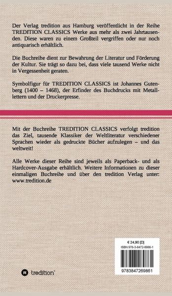 Diese Hardcover-Ausgabe ist Teil der TREDITION CLASSICS. Der Verlag tredition aus Hamburg veröffentlicht in der Buchreihe TREDITION CLASSICS Werke aus mehr als zwei Jahrtausenden. Diese waren zu einem Großteil vergriffen oder nur noch antiquarisch erhältlich. Mit TREDITION CLASSICS verfolgt tredition das Ziel, tausende Klassiker der Weltliteratur verschiedener Sprachen wieder als gedruckte Bücher zu verlegen und das weltweit! Die Buchreihe dient zur Bewahrung der Literatur und Förderung der Kultur. Sie trägt so dazu bei, dass viele tausend Werke nicht in Vergessenheit geraten.