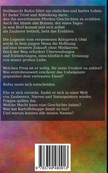 Stallknecht Rufus führt ein einfaches und hartes Leben. Er findet Trost und Ablenkung darin, den ihn anvertrauten Pferden Geschichten zu erzählen. Auch der blinde alte Botmar, der eines Tages in sein Dorf kommt und sich selbst als Zauberer betitelt, liebt das Erzählen. Die Legende vom vergessenen Königreich Odal weckt in dem jungen Mann die Hoffnung auf eine bessere Zukunft ohne Mistkarren. Doch der Weg erfordert Überwindungen und Entbehrungen, einschließlich der Trennung von seiner großen Liebe.Welchen Preis ist er willig, für seine Freiheit zu zahlen? Wie erstrebenswert erscheint das Unbekannte gegenüber dem vertrauten Elend?Rufus muss sich entscheiden.Ehe er sich versieht, findet er sich in einer Welt von Zauberern, Narren und Naturgeistern wieder. Fragen quälen ihn. Welche Macht kann eine Geschichte haben? Warum Kartoffelsuppe? Und warum kennen alle seinen Namen?