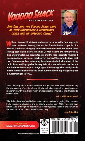 Join Iris and the Voodoo Shack gang as they investigate a mysterious death and an unsolved crime! (For ages 9 and up) When 11-year-old Iris Weston discovers a ramshackle hunting cabin deep in Hazard Swamp, she and her friends decide it's perfect for a secret clubhouse. The gang dubs it the Voodoo Shack and meets there to swap stories and play card games. Ol' Man Hazard, the former owner, died under mysterious circumstances, and the kids speculate whether it was an accident, suicide or maybe even murder! The gang believes that cash from an unsolved crime may have been stashed within feet of the cabin. Even as things go badly awry, feisty Iris learns how to use her wit and independence to put things right, discovering what family really means in this adventurous and often humorous coming-of-age story set in rural Michigan in 1962. "Set in the early 1960s, Martin's novel traces a girl's journey toward understanding the true meaning of love, family and friendship. Iris is an appealing character whose relationships with friends and family are realistically portrayed as she struggles to find her place." --School Library Journal "Martin has drawn on her childhood memories to create an engaging, feisty heroine, lively supporting characters and an easy-to-visualize early 1960s rural Michigan setting. And, although Iris doesn't solve all her mysteries, she finds the answers to the most important ones in this fast-paced story." --ALA Booklist "Readers fond of lightweight mysteries solved by spunky heroines will take to this fiction debut, though a heavy ballast of tragedy and near-tragedy keeps it low to the ground. Some of the dialogue and set pieces show a promising authorial gift for comedy. (Fiction. 10-12)" --Kirkus Reviews ¿"...add to this drama that Iris's grandmother is ill, maybe dying in her fears, and she has messed absolutely everything up. Of course, the obvious thing is to admit all her messes to her parents, but who of us at that age ever did that? Any of us 'grownups' who are the least bit honest know exactly how Iris feels. Kids that age today (in the middle of their hopes, dreams, and fears) find a heroine in Voodoo Shack who they identify with and will begin to feel: If she can do it, I can, too." -- Deborah K. Frontiera, U.P. Book Review This book was originally released as A Family Trait Learn more at www.TerriLynnMartin.com From Modern History Press www.ModernHistoryPress.com