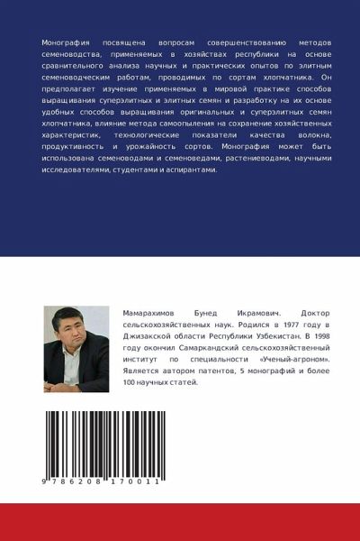 Monografiq poswqschena woprosam sowershenstwowaniü metodow semenowodstwa, primenqemyh w hozqjstwah respubliki na osnowe srawnitel'nogo analiza nauchnyh i prakticheskih opytow po älitnym semenowodcheskim rabotam, prowodimyh po sortam hlopchatnika. On predpolagaet izuchenie primenqemyh w mirowoj praktike sposobow wyraschiwaniq superälitnyh i älitnyh semqn i razrabotku na ih osnowe udobnyh sposobow wyraschiwaniq original'nyh i superälitnyh semqn hlopchatnika, wliqnie metoda samoopyleniq na sohranenie hozqjstwennyh harakteristik, tehnologicheskie pokazateli kachestwa wolokna, produktiwnost' i urozhajnost' sortow. Monografiq mozhet byt' ispol'zowana semenowodami i semenowedami, rasteniewodami, nauchnymi issledowatelqmi, studentami i aspirantami.