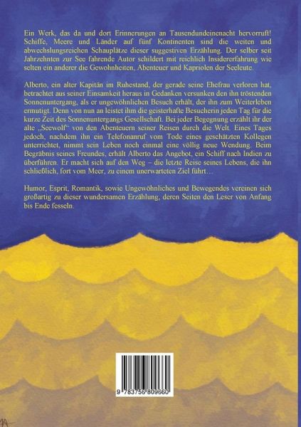 Schiffe, Meere und ferne Länder auf fünf Kontinenten sind die abwechslungsreichen Schauplätze dieser Erzählung. Der Autor, seit Jahrzehnten selber zur See fahrend, schildert mit reichlich Insidererfahrung wie selten ein anderer das Leben der Seeleute.Alberto, ein alter Kapitän im Ruhestand, der gerade seine Ehefrau verloren hat, betrachtet aus seiner Einsamkeit heraus den Sonnenuntergang, als er ungewöhnlichen Besuch erhält, der ihn zum Weiterleben ermutigt. Von nun an leistet ihm die geisterhafte Besucherin jeden Tag bei Sonnenuntergang Gesellschaft. Dabei erzählt ihr der alte "Seewolf", während er in den Erinnerungsstücken seiner Seemannskiste kramt, von den Abenteuern seiner Reisen durch die Welt. Eines Tages jedoch, nachdem ihn ein Telefonanruf vom Todes eines geschätzten Kollegen unterrichtet, nimmt sein Leben noch einmal eine völlig neue Wendung. Beim Begräbnis seines Freundes erhält Alberto das Angebot, ein Schiff nach Indien zu überführen. Er nimmt an und macht sich auf den Weg - die letzte Reise seines Lebens, die ihn schließlich, fort vom Meer, zu einem unerwarteten Ziel führt.Humor, Esprit, Romantik, sowie Ungewöhnliches und Bewegendes vereinigen sich großartig zu dieser wundersamen Erzählung, deren Seiten den Leser von Anfang bis Ende fesseln.