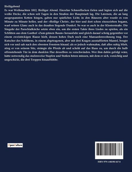 Heiligabend Es war Weihnachten 1812, Heiliger Abend. Einzelne Schneeflocken fielen und legten sich auf die weiße Decke, die schon seit Tagen in den Straßen der Hauptstadt lag. Die Laternen, die an lang ausgespannten Ketten hingen, gaben nur spärliches Licht; in den Häusern aber wurde es von Minute zu Minute heller, und der »Heilige Christ«, der hier und dort schon einzuziehen begann, warf seinen Glanz auch in das draußen liegende Dunkel. So war es auch in der Klosterstraße. Die Singuhr der Parochialkirche setzte eben ein, um die ersten Takte ihres Liedes zu spielen, als ein Schlitten aus dem Gasthof »Zum grünen Baum« herausfuhr und gleich darauf schräg gegenüber vor einem zweistöckigen Hause hielt, dessen hohes Dach noch eine Mansardenwohnung trug. Der Kutscher des Schlittens, in einem abgetragenen, aber mit drei Kragen ausstaffierten Mantel, beugte sich vor und sah nach den obersten Fenstern hinauf; als er jedoch wahrnahm, daß alles ruhig blieb, stieg er von seinem Sitz, strängte die Pferde ab und schritt auf das Haus zu, um durch die halb offenstehende Tür in dem dunklen Flur desselben zu verschwinden. Wer ihm dahin gefolgt wäre, hätte notwendig das stufenweise Stapfen und Stoßen hören müssen, mit dem er sich, vorsichtig und ungeschickt, die drei Treppen hinauffühlte.