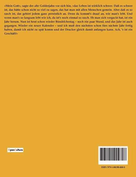 »Mein Gott«, sagte der alte Golderjahn vor sich hin, »das Leben ist wirklich schwer. Daß es schwer ist, das hätte schon nicht so viel zu sagen, das hat man mit allen Menschen gemein. Aber daß es so rasch ist, das gehört jedem ganz persönlich an. Denn da kommt's drauf an, wie man's lebt. Und wenn man's so langsam lebt wie ich, da ist's noch einmal so rasch. Eh man sich verguckt hat, ist ein Jahr herum. Nun ist heut schon wieder Bündelchestag ¿ noch ein paar Stund, und das Jahr ist auch gegangen. Wieder ein neuer Kalender ¿ und ich muß den nächsten schon fürs nächste Jahr fertig haben, damit ich nicht zu spät komm und der Drucker gleich damit anfangen kann. Ach, 's ist ein Geschäft!«