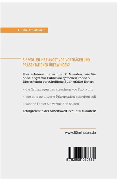 Die Angst vor Vorträgen effektiv bekämpfen ¿ in nur 50 Minuten Ein Raum voller Menschen, ein Podium, auf dem Sie stehen, um einen Vortrag zu halten ¿ fühlt sich das gut an oder macht Ihnen das Angst? Trifft Ersteres zu: Gratulation! Haben Sie allerdings Albträume von solch einer Situation: Willkommen im Club! Es geht Ihnen so wie knapp der Hälfte aller Menschen. Und die gute Nachricht ist: Dagegen kann man etwas tun! Lernen Sie mithilfe dieses praktischen Booklets alles über die wichtigsten Punkte, die Sie beachten sollten und überwinden Sie Ihre Angst vor dem Sprechen vor Publikum. Selbst wenn Sie in dem Fach kein Experte sind, werden Sie Ihre Präsentation erfolgreich über die Bühne bringen können und auf alle Eventualitäten vorbereitet sein. Nach 50 Minuten können Sie: ¿ Ihren Vortrag richtig vorbereiten ¿ Atemübungen zu Ihrer Beruhigung anwenden ¿ ohne Angst vor Publikum sprechen Starten Sie mit diesen praktischen Tipps voll durch! Über 50MINUTEN Für die Arbeitswelt Was bringt Sie im Job weiter? Die Serie Für die Arbeitswelt der Reihe 50Minuten ist für alle geeignet, die sich ¿ egal auf welchem Abschnitt ihrer Karriere ¿ neue persönliche und berufliche Kompetenzen aneignen, ihr Potenzial optimal ausschöpfen oder einfach ihre Work-Life-Balance hinterfragen wollen. Unsere kompakten Titel enthalten nicht nur eine von Experten erstellte Übersicht über die relevante Theorie, sondern auch konkrete Anleitungen, die von zahlreichen Beispielen unterstützt werden. Die einfache und leicht verständliche Formulierung der komplexen Sachverhalte ist somit der ideale Ausgangspunkt für Angestellte, Arbeitgeber und Arbeitssuchende.