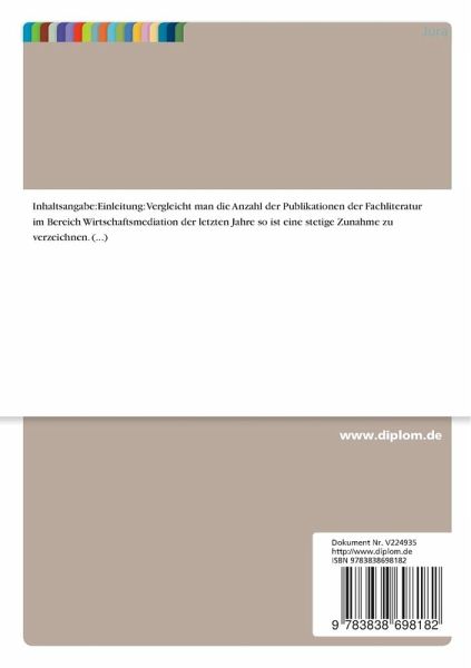 Vergleicht man die Anzahl der Publikationen der Fachliteratur im Bereich Wirtschaftsmediation der letzten Jahre so ist eine stetige Zunahme zu verzeichnen. Als Vorteile von Wirtschaftsmediation werden vor allem die Kostengünstigkeit des Verfahrens im Verhältnis zum gerichtlichen Weg, die Möglichkeit der raschen und zukunftsgerichteten Konfliktlösung, die Vertraulichkeit des Verfahrens, das Finden praxisnaher und gegebenenfalls ungewöhnlicher Lösungen, sowie die Berücksichtigung des Gesamtsystems Betriebs (systemisches Denken) propagiert.