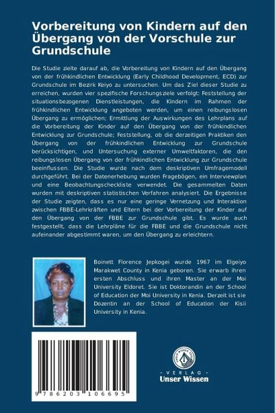 Die Studie zielte darauf ab, die Vorbereitung von Kindern auf den Übergang von der frühkindlichen Entwicklung (Early Childhood Development, ECD) zur Grundschule im Bezirk Keiyo zu untersuchen. Um das Ziel dieser Studie zu erreichen, wurden vier spezifische Forschungsziele verfolgt: Feststellung der situationsbezogenen Dienstleistungen, die Kindern im Rahmen der frühkindlichen Entwicklung angeboten werden, um einen reibungslosen Übergang zu ermöglichen; Ermittlung der Auswirkungen des Lehrplans auf die Vorbereitung der Kinder auf den Übergang von der frühkindlichen Entwicklung zur Grundschule; Feststellung, ob die derzeitigen Praktiken den Übergang von der frühkindlichen Entwicklung zur Grundschule berücksichtigen, und Untersuchung externer Umweltfaktoren, die den reibungslosen Übergang von der frühkindlichen Entwicklung zur Grundschule beeinflussen. Die Studie wurde nach dem deskriptiven Umfragemodell durchgeführt. Bei der Datenerhebung wurden Fragebögen, ein Interviewplan und eine Beobachtungscheckliste verwendet. Die gesammelten Daten wurden mit deskriptiven statistischen Verfahren analysiert. Die Ergebnisse der Studie zeigten, dass es nur eine geringe Vernetzung und Interaktion zwischen FBBE-Lehrkräften und Eltern bei der Vorbereitung der Kinder auf den Übergang von der FBBE zur Grundschule gibt. Es wurde auch festgestellt, dass die Lehrpläne für die FBBE und die Grundschule nicht aufeinander abgestimmt waren, um den Übergang zu erleichtern.