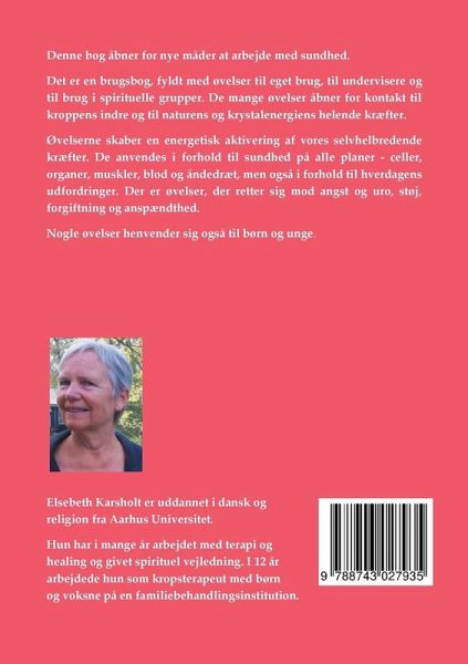 Denne bog åbner for nye måder at arbejde med sundhed. Det er en brugsbog, fyldt med øvelser til eget brug, til undervisere og til brug i spirituelle grupper. De mange øvelser åbner for kontakt til kroppens indre og til naturens og krystalenergiens helende kræfter. Øvelserne skaber en energetisk kontakt, der aktiverer vores selvhelbredende kræfter. De kan anvendes i forhold til sundhed på alle planer, celler, organer, muskler, blod og åndedræt, også i forhold til hverdagens udfordringer. Der er således øvelser, der retter sig mod angst og uro, støj, forgiftning og anspændthed. Nogle øvelser henvender sig også til børn og unge.