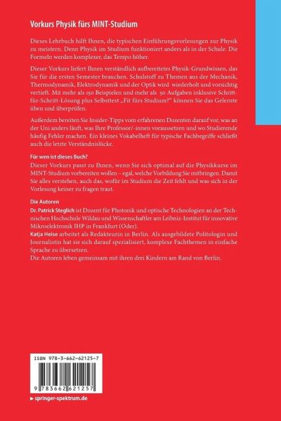 Dieser Vorkurs liefert Ihnen verständlich aufbereitetes Physik-Grundwissen, das Sie für die ersten Semester brauchen. Schulstoff zu Themen aus der Mechanik, Thermodynamik, Elektrodynamik und der Optik wird wiederholt und vorsichtig vertieft. Mit mehr als 150 Beispielen und mehr als 50 Aufgaben inklusive Schritt-für-Schritt-Lösung plus Selbsttest "Fit fürs Studium?" können Sie das Gelernte üben und überprüfen.