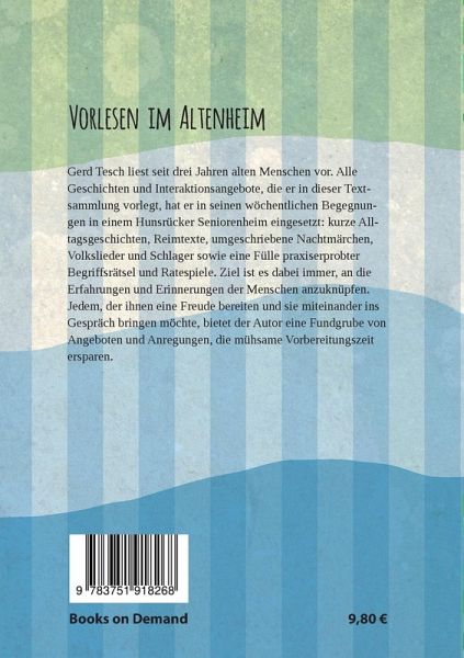 Gerd Tesch liest seit drei Jahren alten Menschen vor. Alle Geschichten und Interaktionsangebote, die er in dieser Textsammlung vorlegt, hat er in seinen wöchentlichen Begegnungen in einem Hunsrücker Seniorenheim eingesetzt: kurze Alltagsgeschichten, Reimtexte, umgeschriebene Nachtmärchen, Volkslieder und Schlager sowie eine Fülle praxiserprobter Begriffsrätsel und Ratespiele. Ziel ist es dabei immer, an die Erfahrungen und Erinnerungen der Menschen anzuknüpfen. Jedem, der ihnen eine Freude bereiten und sie miteinander ins Gespräch bringen möchte, bietet der Autor eine Fundgrube von Angeboten und Anregungen, die mühsame Vorbereitungszeit ersparen.