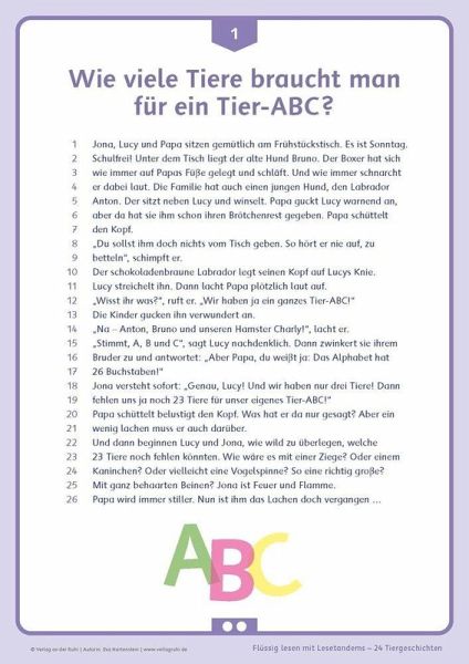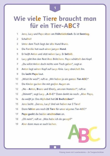 Bunte Textkarten mit Erzähltexten zum Tandemlesen, für Lehrer und Lehrerinnen an Grundschulen, Klasse 3/4 +++Diese praktischen Textkarten lassen sich optimal für das Tandemlesen verwenden und helfen den Schülern und Schülerinnen, sicherer beim Vorlesen zu werden:Sie erhalten 24 kindgerechte Erzähltexte, bei denen sich alles um Tiere dreht. Die Geschichten sind 2-fach differenziert, denn jede Karte enthält sowohl eine einfache als auch eine schwierigere Variante (Vorder- und Rückseite). Zusätzlich erleichtert die Silbenschrift das Lesen.Und so geht's:Ein lesestarkes und ein eher leseschwaches Kind arbeiten als Team zusammen mit demselben Text. Gemeinsam lesen sie die Geschichte halblaut und trainieren durch chorisches Lesen ihre Leseflüssigkeit. Damit das kooperative Lernen problemlos gelingt, gibt es alle Textkarten in doppelter Ausführung - so erhält jedes Kind seine eigene Textkarte.Zu jedem Text gibt es im Download differenzierte Aufgaben, die das Leseverständnis trainieren.Die lustigen Tiergeschichten steigern die Lesemotivation und sind sofort und flexibel einsetzbar - für die regelmäßige Leseförderung oder die Lesezeit. So macht Lesen doppelt Spaß!