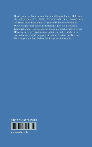 Hegel hat seine Vorlesungen über die 'Philosophie der Religion' viermal gehalten: 1821, 1824, 1827 und 1831. In all diesen Jahren hat Hegel seine Konzeption in großen Teilen neu formuliert. Diese Ausgabe legt daher im Unterschied zu allen früheren Kompilationen Hegels Manuskript und die Nachschriften seiner Hörer aus den vier Kollegien getrennt vor und ermöglicht so erstmals eine entwicklungsgeschichtliche Analyse der Berliner Vorlesungen auf dem Gebiet der Religionsphilosophie.