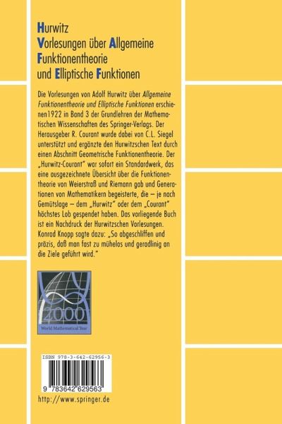 Die Vorlesungen von Adolf Hurwitz über Allgemeine Funktionentheorie und Elliptische Funktionen erschienen 1922 in Band 3 der Grundlehren der Mathematischen Wissenschaften des Springer-Verlags. Der Herausgeber R. Courant wurde dabei von C.L. Siegel unterstützt und ergänzte den Hurwitzschen Text durch einen Abschnitt Geometrische Funktionentheorie. Der "Hurwitz-Courant" war sofort ein Standardwerk, das eine ausgezeichnete Übersicht über die Funktionentheorie von Weierstraß und Riemann gab und Generationen von Mathematikern begeisterte, die - je nach Gemütslage - dem "Hurwitz" oder dem "Courant" höchstes Lob gespendet haben. Das vorliegende Buch ist ein Nachdruck der Hurwitzschen Vorlesungen. Konrad Knopp sagte dazu: "So abgeschliffen und präzis, daß man fast zu mühelos und geradlinig an die Ziele geführt wird."