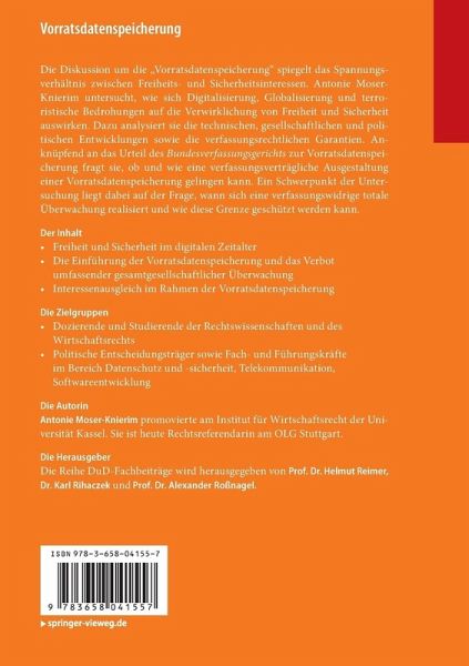 Die Diskussion um die "Vorratsdatenspeicherung" spiegelt das Spannungsverhältnis zwischen Freiheits- und Sicherheitsinteressen. AntonieMoser-Knierim untersucht, wie sich Digitalisierung, Globalisierung und terroristische Bedrohungen auf die Verwirklichung von Freiheit und Sicherheit auswirken. Dazu analysiert sie die technischen, gesellschaftlichen und politischen Entwicklungen sowie die verfassungsrechtlichen Garantien. Anknüpfend an das Urteil des Bundesverfassungsgerichts zur Vorratsdatenspeicherung fragt sie, ob und wie eine verfassungsverträgliche Ausgestaltung einer Vorratsdatenspeicherung gelingen kann. Ein Schwerpunkt der Untersuchung liegt dabei auf der Frage, wann sich eine verfassungswidrige totale Überwachung realisiert und wie diese Grenze geschützt werden kann.