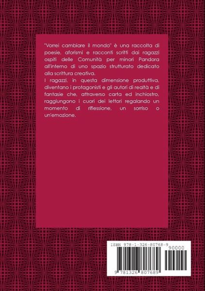 "Vorrei cambiare il mondo" è una raccolta di poesie, aforismi e racconti scritti dai ragazzi ospiti delle Comunità per minori Pandora all'interno di uno spazio strutturato dedicato alla scrittura creativa. I ragazzi, in questa dimensione produttiva, diventano i protagonisti e gli autori di realtà e di fantasie che, attraverso carta ed inchiostro, raggiungono i cuori dei lettori regalando un momento di riflessione, un sorriso o un'emozione.