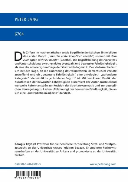 Die Ziffern im mathematischen sowie Begriffe im juristischen Sinne bilden den ersten Knopf. "Wer das erste Knopfloch verfehlt, kommt mit dem Zuknöpfen nicht zu Rande" (Goethe). Die Begriffsbildung des Vorsatzes und Unterscheidung zwischen dolus eventualis und bewusster Fahrlässigkeit gilt als eine der schwierigsten Frage der Strafrechtsdogmatik. Der Verfasser befasst sich mit der Frage, ob die Einordnung des voluntativen Elements zum Vorsatz zutreffend und ob "bewusste Fahrlässigkeit" eine ontologisch "gefundene Kategorie" oder ein fiktiv "erfundener Begriff" ist. Mit dem klaren Verdikt der Künstlichkeit der bewussten Fahrlässigkeit präsentiert der Autor anschließend wertvolle Reformanstöße zur Revision der Straftatsystematik und zur gesetzlichen Neuregelung zu Lasten (Ablehnung) der bewussten Fahrlässigkeit, die an sich eine "contradictio in adjecto" darstellt.