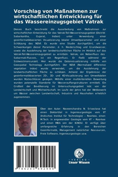 Dieses Buch beschreibt die Ausarbeitung von Maßnahmen zur wirtschaftlichen Entwicklung für das Vatrak-Teil-Wassereinzugsgebiet (Distrikt Sabarkantha, Gujarat, Indien) unter Verwendung einer geoinformatikbasierten Visualisierung lokaler Umweltparameter und einer Schätzung des NDVI. Es wurde eine Studie durchgeführt, um die Schwankungen dieser Parameter, d. h. Niederschlag und Grundwasser, sowie die Ausdehnung der landwirtschaftlichen Fläche im Hinblick auf das Vatrak-Teil-Wassereinzugsgebiet zu ermitteln. Vatrak, ein Nebenfluss des Sabarmati-Flusses, ist ein Regenfluss. Er fließt während der Südwestmonsunzeit. Hier wurde die Datenvisualisierung mithilfe von Geospatial Technology durchgeführt. Der NDVI (Normalized difference vegetation index) wurde verwendet, um die Ausdehnung der landwirtschaftlichen Fläche zu schätzen. Anhand der Ergebnisse der geoinformatikbasierten 2D-, 3D- und 4D-Visualisierung von Umweltdaten wurden Rückschlüsse gezogen. Mithilfe einer multikriteriellen Bewertung wurden potenzielle Standorte für Wasserauffangstrukturen ermittelt. Ein Großteil der Bevölkerung im Untersuchungsgebiet lebt von der Landwirtschaft und Milchwirtschaft. Im Laufe der Jahre hat der Wettbewerb um Wasser zwischen Landwirtschaft, Industrie und Haushalten erheblich zugenommen.