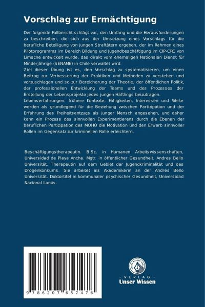 Der folgende Fallbericht schlägt vor, den Umfang und die Herausforderungen zu beschreiben, die sich aus der Umsetzung eines Vorschlags für die berufliche Beteiligung von jungen Straftätern ergeben, der im Rahmen eines Pilotprogramms im Bereich Bildung und Jugendbeschäftigung im CIP-CRC von Limache entwickelt wurde, das direkt vom ehemaligen Nationalen Dienst für Minderjährige (SENAME) in Chile verwaltet wird.Ziel dieser Übung ist es, den Vorschlag zu systematisieren, um einen Beitrag zur Verbesserung der Praktiken und Methoden zu verstehen und vorzuschlagen und so zur Bereicherung der Theorie, der öffentlichen Politik, der professionellen Entwicklung der Teams und des Prozesses der Erstellung der Lebensprojekte jedes jungen Häftlings beizutragen.Lebenserfahrungen, frühere Kontexte, Fähigkeiten, Interessen und Werte werden als grundlegend für die Beziehung zwischen Partizipation und der Erfahrung des Freiheitsentzugs als junger Mensch angesehen, und daher kann ein Prozess des sinnvollen Experimentierens durch die Ebenen der beruflichen Partizipation des MOHO die Motivation und den Erwerb sinnvoller Rollen im Gegensatz zur kriminellen Rolle erleichtern.