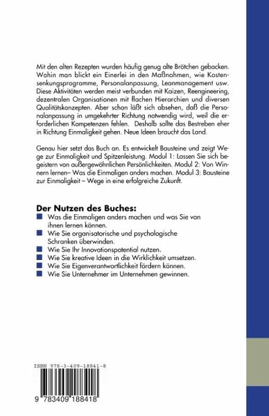 Modul 1 Lassen Sie sich begeistern von außergewöhnlichen Persönlichkeiten.- Sieben Facetten von Innovation und Kreativität.- Das Risiko.- Personale Barrieren.- Organisatorische Barrieren.- Innovationsmanagement.- Innovationstechniken und Instrumente.- Offene Fragen.- Innovation am Beispiel 3M.- Visionen gefragt.- Innovation braucht Kultur.- Struktur zum Erfolg.- Customer Service Excellence.- Eisberg der Ignoranz.- Service-Erfolgs-Kette.- Kommunikation nach innen.- Interne und externe Qualität.- Strategische Kommunikation.- 3M Kultur.- Anforderungen und Leistungen.- Mit Marketing-Effizienz zum Erfolg.- 3M und Umwelt.- Quellen der Innovation.- Herausforderung annehmen Leben mit unheilbarer Krankheit.- Die Lösungs-Richtungen.- Zielkorrektur, Abschied von Wünschen.- Innovativ leben.- Leidenschaftlich leben Leben in Fülle gewinnen.- Fazit Modul 1: Lassen Sie sich be-Geist-ern Erfahrungen außergewöhnlicher Persönlichkeiten.- Modul 2 Von Winnern lernen Was die Einmaligen anders machen.- Dienstleister sein heißt, Kundenerwartungen zu übertreffen.- Die Dienstleister müssen die Erwartungen des Kunden kennen.- Die Kosten sind entscheidend.- Der Investor ist Langzeitkunde.- Beim Kunden wird das Geld verdient.- Den Zufall provozieren Beispiel eines neuen ökologischen Werkstoffs.- Die Idee.- Die Planung.- Der Flachs-Werkstoff.- Die Planungsschritte.- Die Vorbereitungsmaßnahmen.- Die Produktweiterentwicklung.- Schaffung der Produktionsbedingungen.- Unsere vielleicht wichtigste Erkenntnis.- Motivation zur Innovation Freisetzung von Kreativpotential.- Erschließung innovativer bereichsinterner Ressourcen.- Innovationsprojekte und Umsetzung innovativer Maßnahmen.- Fazit Modul 2: Von Winnern lernen Was machen die Einmaligen anders?.- Modul 3 Bausteine zur Einmaligkeit Wege in eine erfolgreiche Zukunft.- Die Kreativität der Zukunft Die neue Online-Kreativität.- Szenarien.- Der Rezipient wird kreativer Produzent.- Der Rezipient wird kreativer Prosumer.- Der Rezipient wird kreativer Netzwerk-Nomade.- Die Kreativität wird digital.- Die Kreativität beschleunigt sich radikal.- Die Kreativität wird fraktal.- Die Online-Welt und ihre Kreativität schafft völlig neue Probleme.- Die Kreativität der Zukunft bringt völlig neue Gefahren.- Chancen und Risiken auf dem Weg zu kompromißloser Kundenorientierung.- GROHE ein Teilnehmer des Sanitärmarktes in Deutschland.- Zielgruppenmarketing und konsequente Kundenorientierung.- Warum ist beste Kundenorientierung heute und vor allen Dingen morgen entscheidend für den Erfolg?.- Beispiele aus einem Neupositionierungsprozeß.- Risikoreicher Aktionismus versus Kontinuität und Beständigkeit.- Fundament Dynamik Kontinuität.- Innovation Zauberformel oder Knochenarbeit.- Atemberaubende Beispiele der letzten Jahrzehnte.- Das Ziel heißt Innovationsfähigkeit.- Neue Wege finden.- Für Innovationen gibt es kein einfaches Rezept.- Einstellungs- und Bewußtseinswandel in der Berufs- und Privatwelt.- Strategie I: Ziel und Ergebnissteuerrung.- Strategie II: Prozeß- und Verhaltenssteuerung.- Strategie III: Einstellungs- und Bewußtseinsentwicklung.- Eine pragmatische und ethische Vision.- Fazit Modul 3: Bausteine zur Einmaligkeit Wege in eine erfolgreiche Zukunft.- Autoren und Herausgeber.