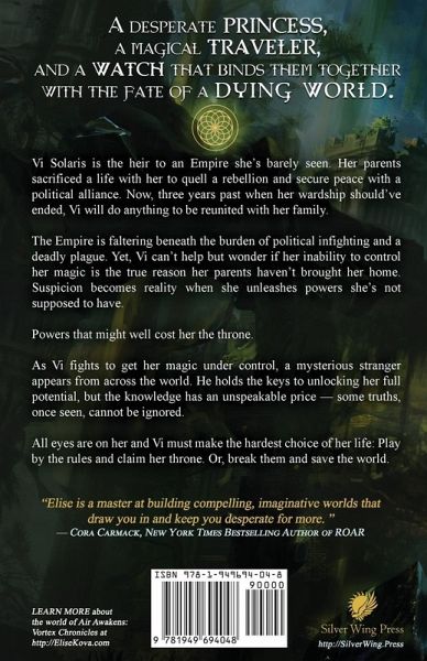 A desperate princess, a magical traveler, and a watch that binds them together with the fate of a dying world. Vi Solaris is the heir to an Empire she’s barely seen. Her parents sacrificed a life with her to quell a rebellion and secure peace with a political alliance. Now, three years past when her wardship should’ve ended, Vi will do anything to be reunited with her family. The Empire is faltering beneath the burden of political infighting and a deadly plague. Yet, Vi can’t help but wonder if her inability to control her magic is the true reason her parents haven’t brought her home. Suspicion becomes reality when she unleashes powers she’s not supposed to have. Powers that might well cost her the throne. As Vi fights to get her magic under control, a mysterious stranger appears from across the world. He holds the keys to unlocking her full potential, but the knowledge has an unspeakable price — some truths, once seen, cannot be ignored. All eyes are on her and Vi must make the hardest choice of her life: Play by the rules and claim her throne. Or, break them and save the world.