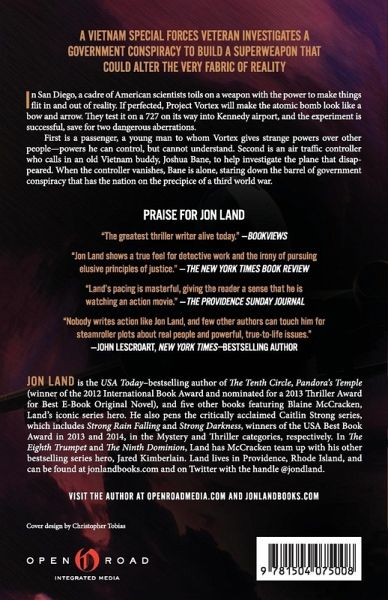 A Vietnam special-forces veteran investigates a government conspiracy to build a superweapon that could alter the very fabric of reality In San Diego, a cadre of American scientists toils on a weapon with the power to make things flit in and out of reality. If perfected, Project Vortex will make the atomic bomb look like a bow and arrow. They test it on a 727 on its way into Kennedy airport, and the experiment is successful, save for two dangerous aberrations. First is a passenger, a young man to whom Vortex gives strange powers over other people--powers he can control, but cannot understand. Second is an air traffic controller who calls in an old Vietnam buddy, Joshua Bane, to help investigate the plane that disappeared. When the controller vanishes, Bane is alone, staring down the barrel of government conspiracy that has the nation on the precipice of a third world war. This ebook features an illustrated biography of Jon Land including rare photos from the author's personal collection.