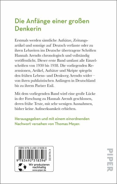 Erstmals werden sämtliche Aufsätze, Zeitungsartikel und sonstige auf Deutsch verfasste oder zu ihren Lebzeiten ins Deutsche übertragene Schriften Hannah Arendts chronologisch und vollständig in einer auf vier Bände angelegten Edition veröffentlicht. Die Ausgabe wird zahlreiche bislang unbekannte und unveröffentlichte Texte enthalten. Damit wird die von Thomas Meyer herausgegebene Studienausgabe alle deutschen Arbeiten Arendts vereinen. Die Bände sind jeweils mit einem ausführlichen Nachwort verschiedener Expert:innen versehen. Der erste Band umfasst alle Einzelschriften von 1930 bis 1941.